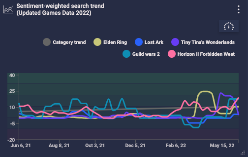 For example, by looking at Share of Search plus weighted sentiment data, gaming publishers could see that while Elden Ring dominates the conversation with 86% share of search on Google, sentiment around those searches is in heavy decline, giving them insight into how to pivot their marketing efforts to amplify sales of new copies of the game.